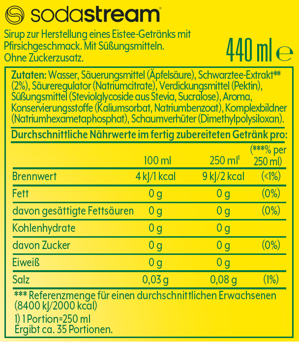 ERST SPRUDELN DANN SIRUP HINZUFÜGEN. Inhalt: 440 ml Getränkesirup, ausreichend für 9 Liter Fertiggetränk Im Vertrieb durch: