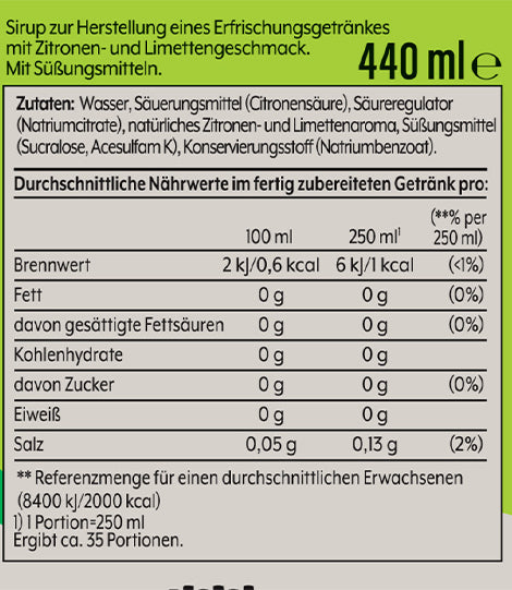 Dosierung: 1 Teil Sirup + 19 Teile Wasser im Glas oder in der Flasche mischen.