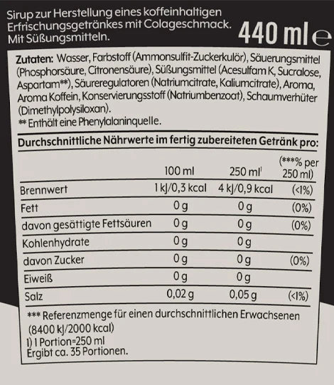 4. Flasche verschließen und leicht schwenken. Fertig! Inhalt: 440ml Getränkesirup, ausreichend für 9 Liter Fertiggetränk.